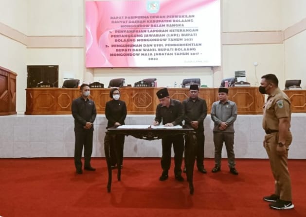 BOLMONG,dutademokrasi.com – Dewan Perwakilan Rakyat Daerah (DPRD) Kabupaten Bolaang Mongondow (Bolmong) menggelar rapat paripurna dalam rangka penyampaian Laporan Keterangan Pertanggung Jawaban (LKPJ) Bupati dan Pengumuman usul Pemberhentian Bupati dan Wakil Bupati periode 2017-2022.