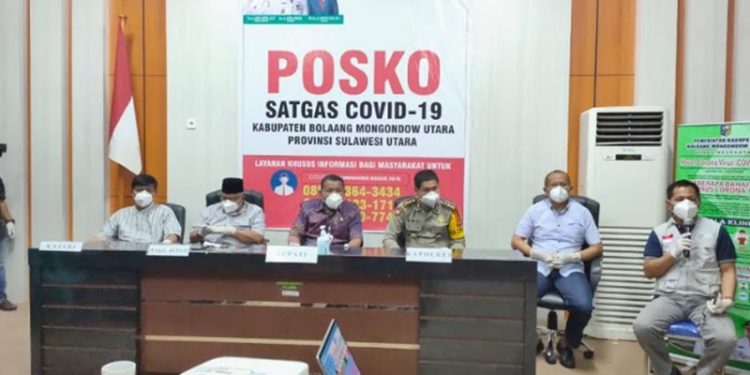 BOLMUT, dutademokrasi.com – Pemerintah Daerah (Pemda) Bolaang Mongondow Utara (Bolmut), menggelar Konferensi Pers di Posko Satuan Gugus Tugas (Satgas) Covid-19, Jumat (10/05/2020).