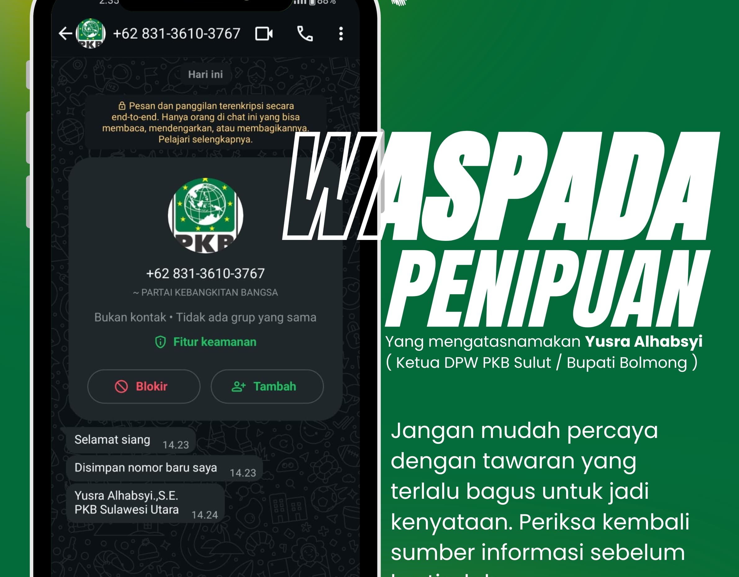 Yusra Alhabsyi yang juga sebagai Ketua DPW PKB Sulawesi Utara, mengaku dirinya tidak ada nomor baru. Pesan yang beredar dimintanya untuk waspada terhadap modus penipuan. “Itu bukan nomor saya dan bukan dari tim resmi PKB Sulut. Pesan yang beredar itu jelas tidak benar,” tegas Yusra, Minggu (28/09/2025).