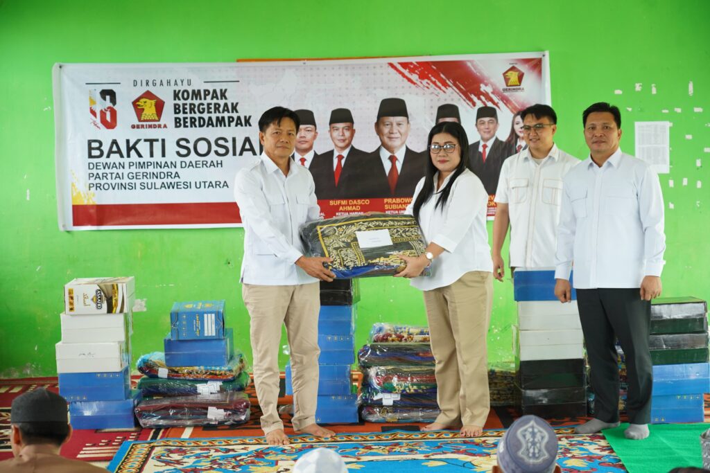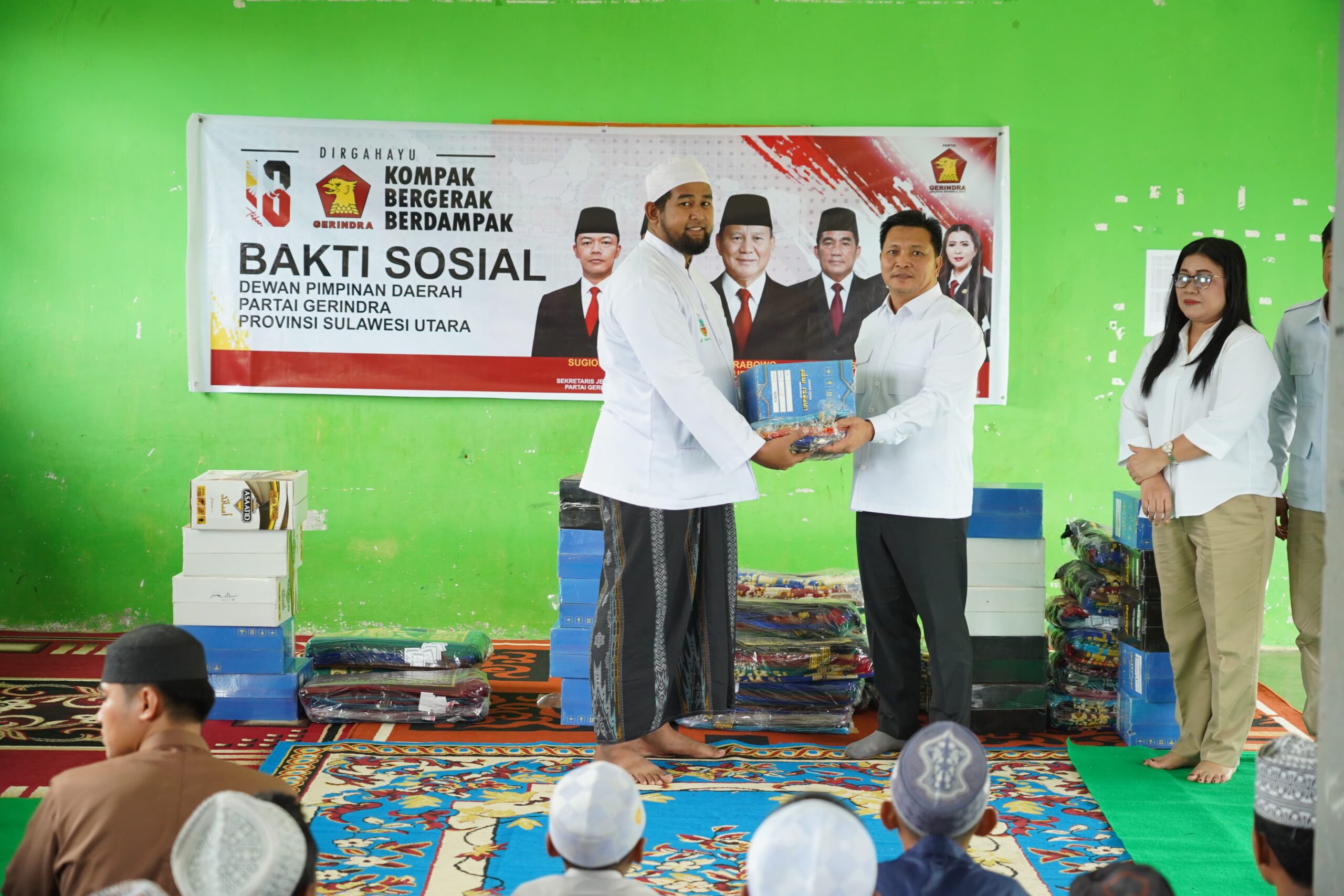 Bakti Sosial yang diselenggarakan ini, Partai Gerindra Sulawesi Utara menyerahkan bantuan peralatan sholat dan perlengkapan ibadah penunjang kegiatan belajar/mengajar pondok pesantren Al-hidayah.