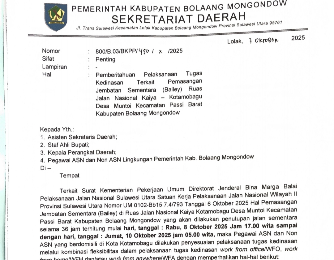 BOLMONG, dutademokrasi.co.id– Sesuai dengan surat pemberitahuan pemasangan jembatan akses jalan Kaiya-Kotamobagu, tepatnya di Desa Munroi Kecamatan Passi Barat, Kamis (09/10/2025) besok, Pemerintah Kabupaten Bolaang Mongondow mengeluarkan surat edaran kebijakan kerja bagi Pegawai Negeri Sipil (PNS) yang berdomisili di Kotamobagu.