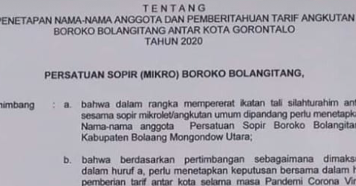 “Sejak selasa kemarin, tarif dari Boroko – Bolangitang ke Gorontalo naik jadi Rp 80 ribu per orang, dan tarif tersebut telah kita sepakati bersama dengan seluruh sopir,”ujar Muhlis Datukramat salah satu sopir kepada dutademokrasi.com, Rabu (17/06/2020).