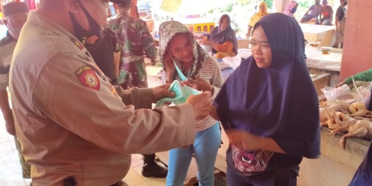 Kapolsek Urban Kaidipang, Kompol Made Sumadia bersama anggota dan dibantu anggota Koramil Kaidipang bagikan masker dipasar tradisional Boroko dan Terminal Type A Boroko, Selasa (25/08/2020).