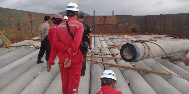 BOLMUT,dutademokrasi.com – Dua pria bekerja sebagai tenaga kerja bongkar muat (TKBM) PT Bogani Pantura Celebes, yang bertugas sebagai tukang juru ikat ditimpa tiang pancang saat melakukan bongkar muat di Dermaga pelabuhan khusus PLTU Binjeita II, Kecamatan Bolangitang Timur, Kabupaten Bolaang Mongondow Utara sekira pukul 17.00 WITA, yang mengakibatkan Fabian Rooroh (20) warga Kelurahan Batu Putih Kecamatan Ranowulun, Kota Bitung meninggal dan Billi Adrian Pangemanan (24) mengalami luka memar di bagian dada, bahu sebelah kiri, kaki sebelah kanan dan mengeluarkan darah dari telinga sebelah kanan.